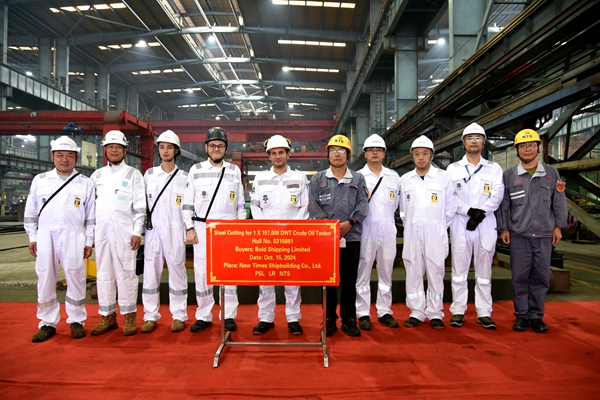 On October 15, 2024, the steel cutting of one 157,000 DWT Crude Oil Tanker bearing builder's hull no. 0315881 has been carried out successfully by New Times Shipbuilding Co., Ltd..The representatives from shipyard, the Owner Polembros Shipping Limited together with the representatives from LR classification society attended and witnessed this event.