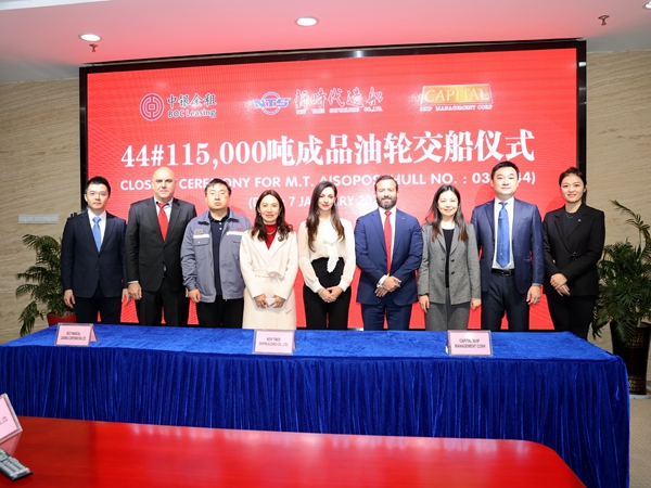 The closing ceremony was held at the meeting room on 8th floor of New Times Office Building. Our Executive Deputy General Manager Mr. Zhang Yuyong, the representatives from Capital Ship Management Corp Mr. Nikolas Vaporis and BOC Financial Leasing Corporation Limited Mr. Shi Yihang signed the delivery documents. The vessel was smoothly and successfully delivered by us and accepted by the Owner.