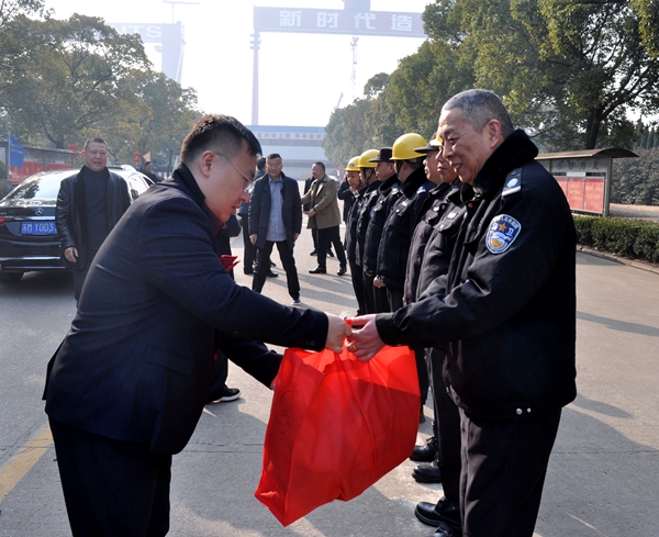 2月10日,農(nóng)歷大年初一上午9時許,公司領導袁凱飛、朱炳康、劉海金、周燦榮、張玉永、袁衡、杜江、鄭忠、徐震宇、劉鋒一行先后來到西區(qū)北門、西區(qū)食堂、新區(qū)碼頭2#引橋、新區(qū)空壓機房、新區(qū)中門,看望、慰問春節(jié)假日期間依然在寒冬中堅守崗位、默默工作的后勤保衛(wèi)工作人員;項目組、電裝部、機裝部、設備部等部門的值班人員,祝福大家身體健康、闔家幸福、萬事如意,鼓勵大家以飽滿的熱情、戰(zhàn)斗的姿態(tài)為各項工作的全面完成做出新的貢獻。