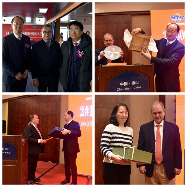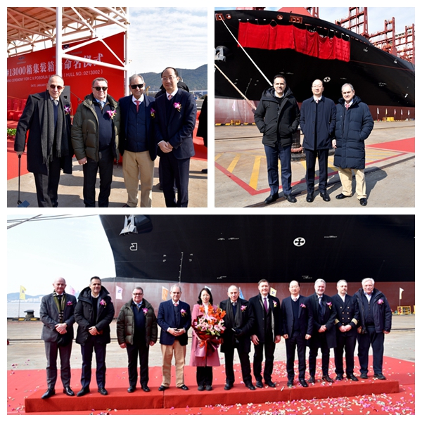 命名結(jié)束后,2#13000箱集裝箱船簽字交付儀式在駕駛室隆重舉行,常務(wù)副總經(jīng)理張玉永與船東技術(shù)總監(jiān)Spyros Papandreou共同簽署交船文本,該船正式交付船東運營。2#13000箱集裝箱船總長335米,兩柱間長325米,型寬51米,型深27.3米,設(shè)計吃水13米,結(jié)構(gòu)吃水16米,空高(基準(zhǔn)線以上)小于65米,載重噸139,550噸(結(jié)構(gòu)吃水下)。希臘船東Chartworld航運公司在我們企業(yè)訂制了兩艘13000箱集裝箱船,此次交付的是第2艘。