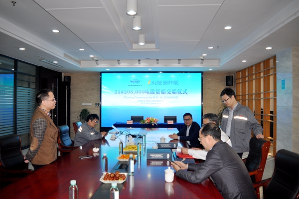 10月23日,公司在辦公樓八樓會(huì)議室舉行船舶簽字交付儀式,21#208000噸散貨船交付船東運(yùn)營(yíng)?偨(jīng)理劉海金、常務(wù)副總經(jīng)理張玉永與韓國(guó)船東H-Line Shipping Co., Ltd.代表等嘉賓共同出席活動(dòng)。