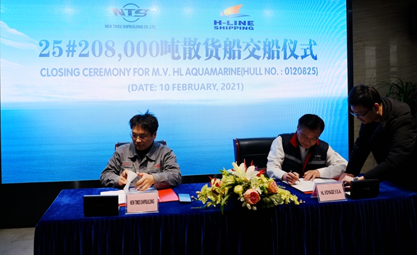就在一周前的2月10日,農(nóng)歷臘月廿九,公司在辦公樓八樓會議室為25#208000噸散貨船舉行了交付簽字儀式,這標志著韓國船東H-Line Shipping Co., Ltd.在我們公司訂制5艘208000噸散貨船項目已全部按期完工交付。