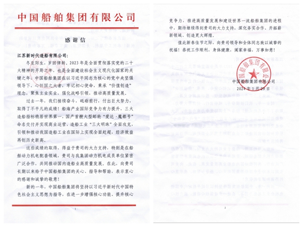 正如感謝信中所述,新的一年,我們與中國船舶集團(tuán)在共同推動(dòng)國內(nèi)造船業(yè)高質(zhì)量發(fā)展的進(jìn)程中,將繼續(xù)深化務(wù)實(shí)合作、開拓嶄新領(lǐng)域、創(chuàng)造更大輝煌!