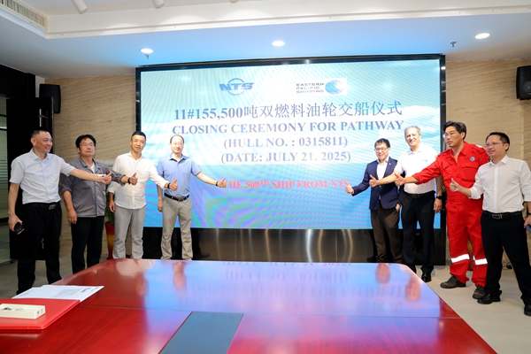 7月21日上午,公司在八樓會議室舉行船舶簽字交付儀式,11#155500噸LNG雙燃料動力油船“PATHWAY”號(0315811#)正式交付新加坡船東EPS運(yùn)營,這是公司歷史上交付的第500艘萬噸船。