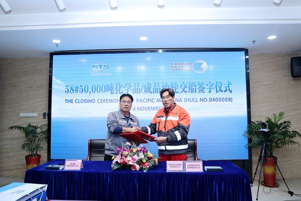 11月4日上午,公司在辦公樓八樓會議室舉行船舶簽字交付儀式,58#50000噸Ⅱ類化學品船交付新加坡船東EPS公司運營。