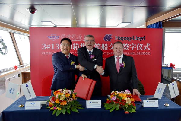 命名結(jié)束后,3#13000箱集裝箱船簽字交付儀式在駕駛室隆重舉行,公司常務(wù)副總經(jīng)理張玉永先生與船東赫伯羅特公司船隊(duì)總經(jīng)理Richard von Berlepsch先生、高級(jí)總監(jiān)Lutz-Michael Dyck先生共同簽署交船文本,該船正式交付船東運(yùn)營(yíng)。