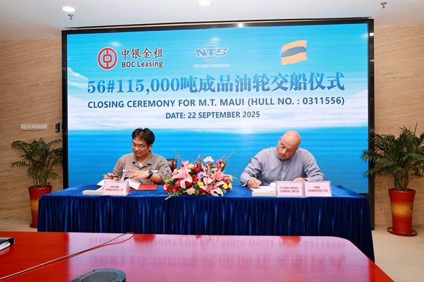 9月22日中午,56#115000噸油船簽字交付儀式在辦公樓八樓會議室舉行,常務(wù)副總經(jīng)理張玉永、副總經(jīng)理袁衡與希臘船東TMS現(xiàn)場經(jīng)理Konstantinos Aloimonos出席,見證船舶交付。