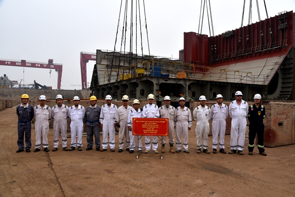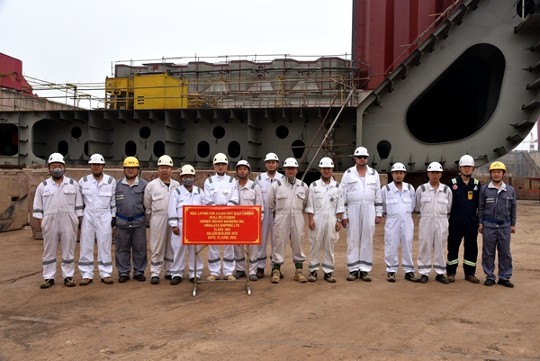 在鞭炮齊鳴中,39#40#210000噸雙燃料動力散貨船船體結構開始合攏搭載。該型210000噸雙燃料動力散貨船總長299.95米,兩柱間長294.75米、型寬50.00米,型深25.20米,設計吃水18.40米,結構吃水18.48米,載重噸210000MT。
