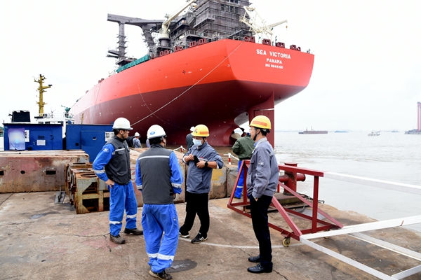 10月15日下午3:00,公司2#塢區(qū)域,5#325000噸超大型礦砂船有序開展船舶下水工作,隨著海事拖輪緩緩發(fā)力,新船駛離船塢,順利實現(xiàn)下水大節(jié)點。