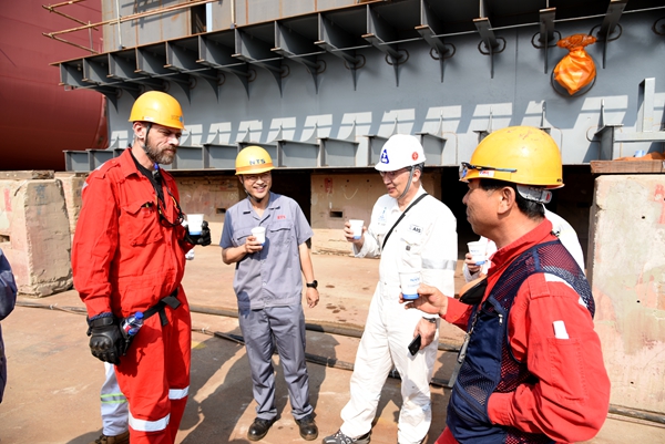副總經(jīng)理朱韓鋼、總經(jīng)理助理丁柏英分別與兩船的船東代表共同出席活動,見證船舶開始合攏建造。