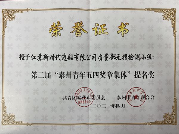 近日,由共青團(tuán)泰州市委、泰州市青年聯(lián)合會(huì)組織的第二屆“泰州青年五四獎(jiǎng)?wù)隆痹u選活動(dòng)揭曉,公司質(zhì)量部無損檢測小組榮獲“泰州青年五四獎(jiǎng)?wù)录w”提名獎(jiǎng)。